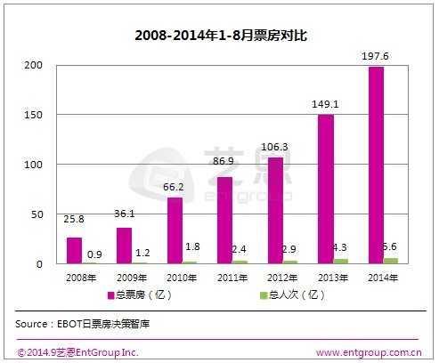 截止8月31日,内地电影总票房累计达197.6亿,即将触线200亿大关,将在9月份无悬念的超越2013年全年217亿的票房成绩,观影人次约5.6亿,纵观2008-2014年1-8月票房成绩,在影院、银幕等硬性设备扩充下,票房增幅高达666%,2014年成绩较2012年增幅也有86%,如此火热的电影市场吸引着跨界资本的不断涌入。2014年暑期档大盘累计进账超90亿,较2013年档期58亿的总票房同比增幅超56%,观影人次2.5亿。