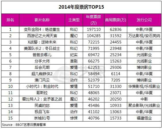 截止目前,2014年度票房TOP15中国产影片占据8席,暑期档新晋榜单影片多达7部,其中《分手大师》《后会无期》《小时代3》等话题影片均票房超5亿。国产惊悚片《京城81号》也一举打破国产惊悚片不破亿的魔咒,将票房纪录提升至4亿,福建恒业在后续项目中已将《京城81号2》列入时间表。