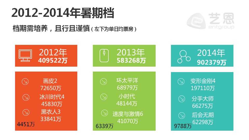 2014年度暑期档票房累计超90亿,同比增幅超55%,在档期内国产/进口片票房分布为44:46,国产片在“档期保护”下仍败下阵来,其中较大因素为《变形金刚4》的单片贡献在档期内近22%,其系列片基础、中国元素等成为吸金保证,也成就了中国内地首部票房超3亿美元的影片。