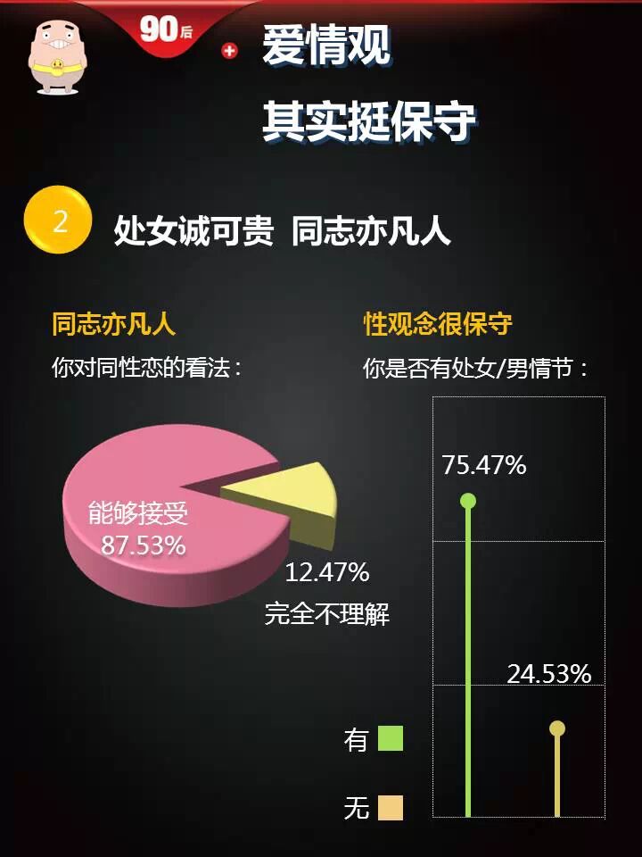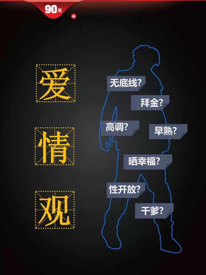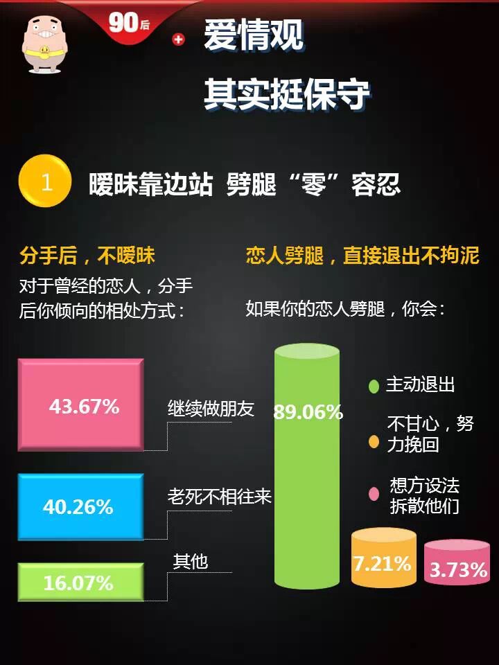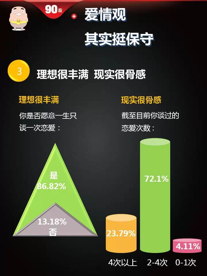 2、90后的爱情观——其实挺保守:90后仍有处女处男情结,仍期待一辈子一次的恋爱。但他们也敢爱敢恨,爱得干脆:分手不暧昧,恋人劈腿直接退出不拘泥。