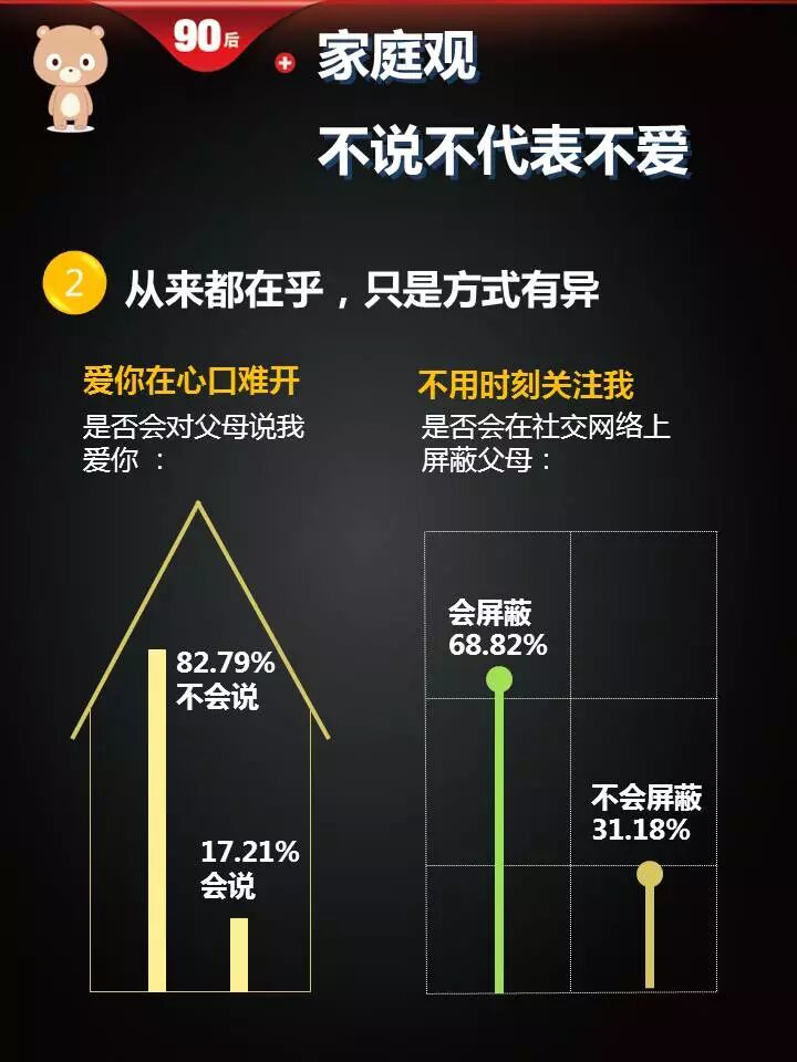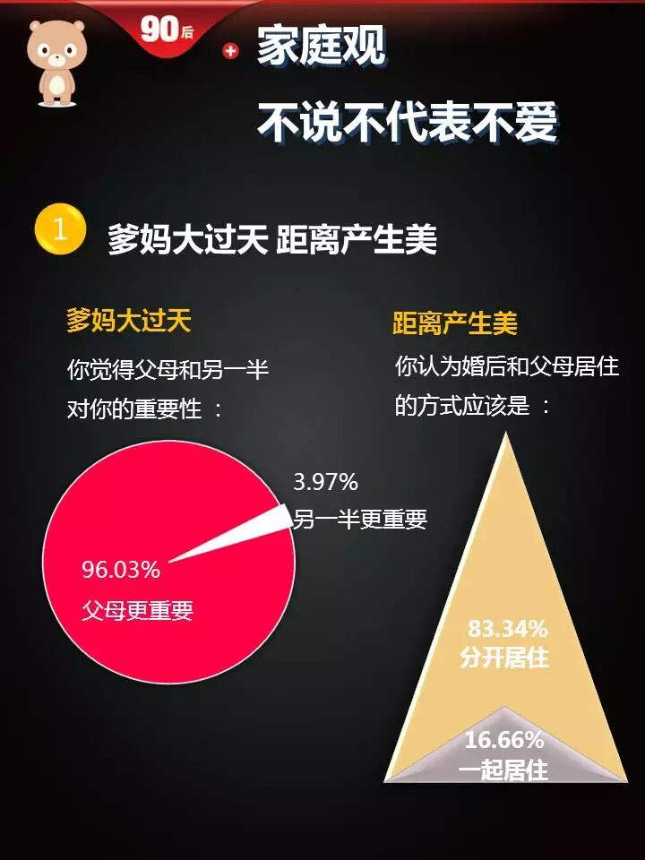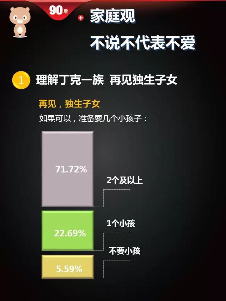 5、90后的家庭观——不说不代表不爱:在乎父母,也强调个人独立。能接受丁克的前卫,也更愿意要两个孩子避免下一代的孤独。
