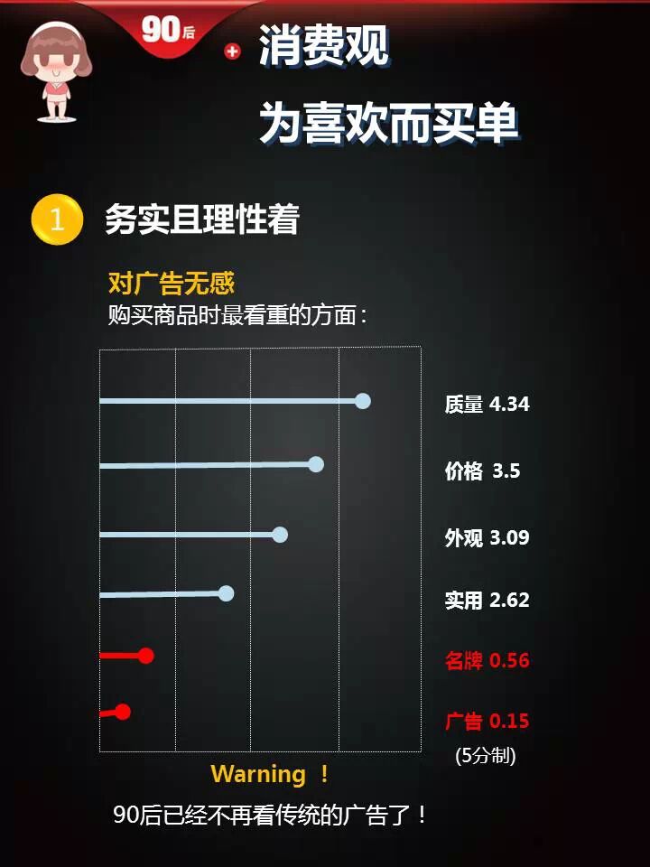 4、90后的消费观——为喜欢而买单:90后消费务实而理性,对广告无感,强调个性。为喜欢的东西,可以尽一切努力为其买单。