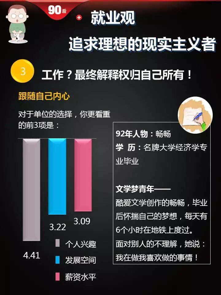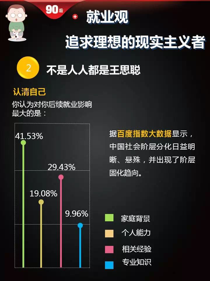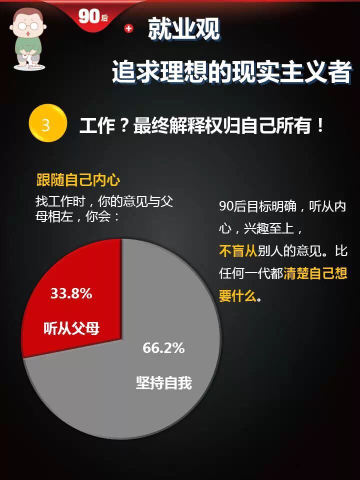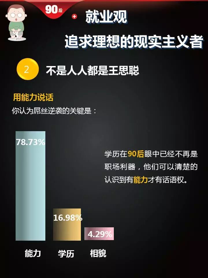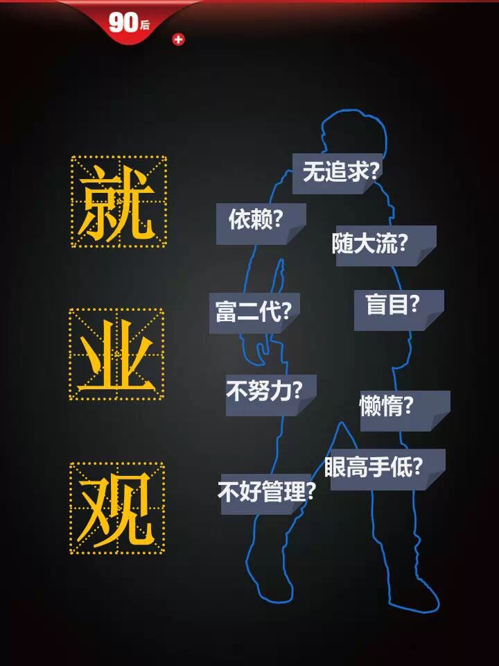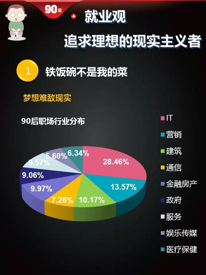 6、90后的就业观——追求理想的现实主义者:不爱铁饭碗,倾向兴趣和自主创业。在现实面前,又能认得清个人能力,懂得进退。