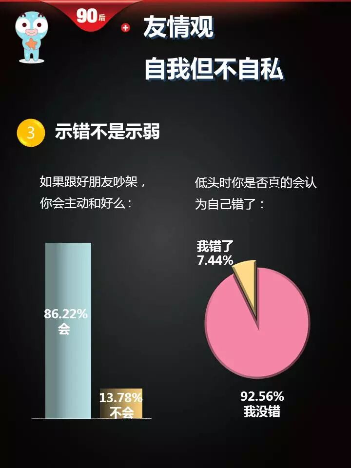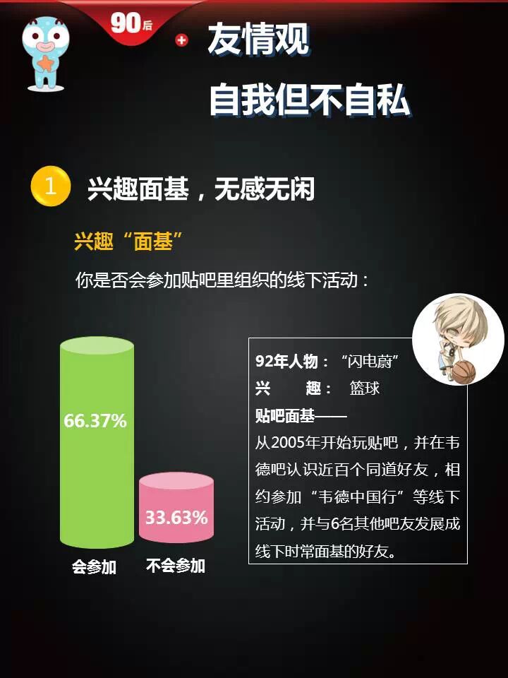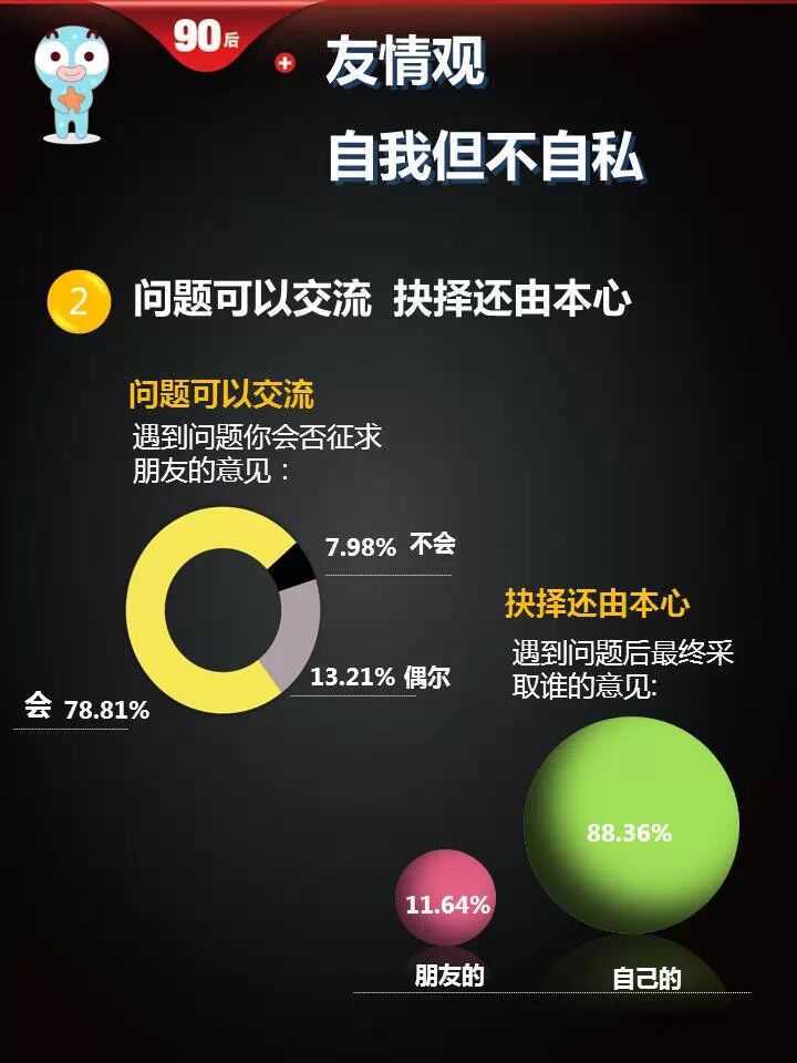 3、90后的友情观——自我但不自私:90后并不爱见网友,强调兴趣圈子的构建,才有“面基”的可能。在乎朋友,但抉择更听从本心。