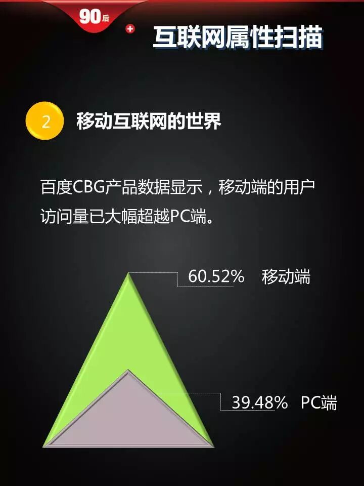 1、互联网原住民:90后平均网龄达7.53年,日均上网时长达11.45小时。百度CBG产品数据显示,移动端用户访问量大幅超越PC端,比重分别为60.52%和39.48%。