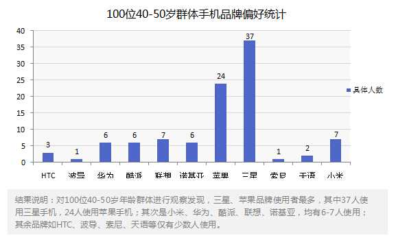 本次调查主要选择了40-50岁年龄层次的群体,使用观察法对其手机使用状况及品牌偏好进行了调查。