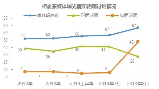 2014年8月份,随着媒体对柯震东吸毒消息接连曝光,CelebrityZ数据显示,关于柯震东的话题讨论总体呈增长趋势,其中负面话题讨论骤增,正面话题讨论有明显下降。