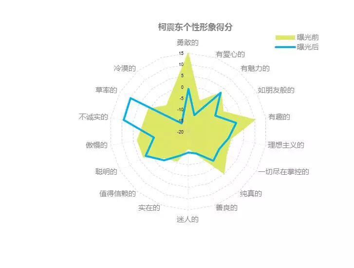 柯震东对《那些年,我们一起追的女孩》和《小时代》这类青春主题电影的饰演,在消费者心目中成功树立起纯真、勇敢、有趣的形象。然而吸毒消息曝光后,柯震东在消费者心目中,不仅之前树立起来的纯真、勇敢、有趣的形象荡然无存,还形成了不诚实的、草率的负面印象。