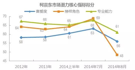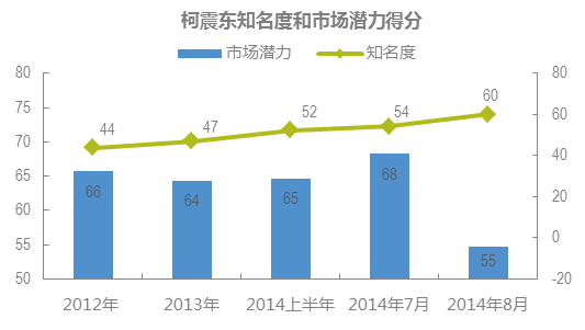 MillwardBrown CelebrityZ数据显示,从2012年至今,柯震东的知名度得分一直稳步提升;但其市场潜力得分逐步提升至2014年7月达到峰值后,于2014年8月急剧下降。
