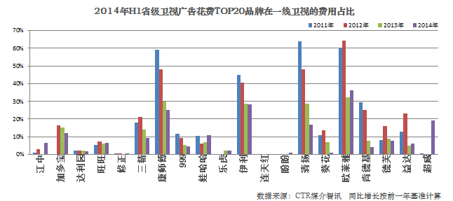 另外,省级卫视的广告一线卫视广告空间有限,且价格高企,一些品牌逐渐游离。2014上半年省级卫视花费TOP20品牌,最近4年同期在一线卫视的花费占比,多数都在减少,康师傅、伊利、清扬、欧莱雅、肯德基都表现明显。
