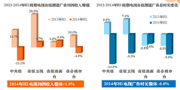 CTR媒介智讯对2014上半年电视广告的分析发现,电视广告的刊例收入有放缓之势,2014上半年1.9%的增幅,大大低于2013年同期的增长水平。