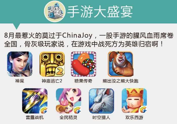 8月最惹火的莫过于ChinaJoy,一股手游的腥风血雨席卷全国,在展会上看完showgirl,回家继续“攻城掠地”!《神魔》、《神庙逃亡2》、《熊出没之熊大快跑》、《雷霆战机》、《时空猎人》等是玩家们最爱的手游神作。