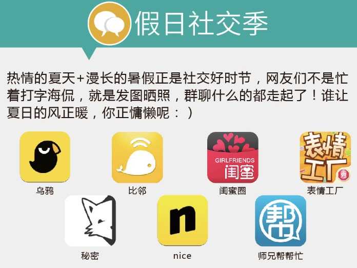 热情的夏天+漫长的暑假正是社交好时节,网友们不是忙着打字海侃,就是发图晒照,群聊什么的都走起了!《乌鸦》、《闺蜜圈》、《秘密》、《比邻》、《nice》……少不得的还有提供丰富聊天表情的《表情工厂》,谁让夏日的风正暖,你正慵懒呢~