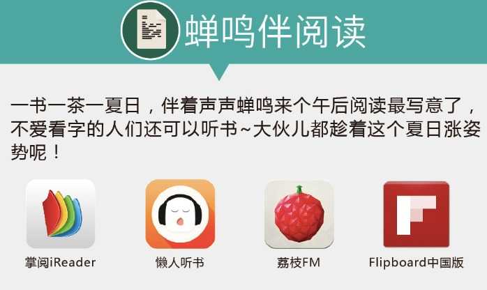一书一茶一夏日,伴着声声蝉鸣来个午后阅读最写意了,《掌阅iReader》、《Flipboard中国版》为读者们提供新鲜资讯,不爱看字的人们还可以用《懒人听书》、《荔枝FM》听书,一起趁着这个夏天涨姿势!