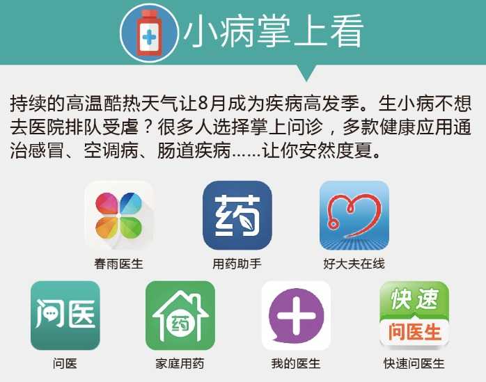 持续的高温酷热天气让8月成为疾病高发季。生小病不想去医院排队受虐?很多人选择掌上问诊,《春雨医生》、《用药助手》等多款健康应用通治感冒、空调病、肠道疾病……让你安然度夏。