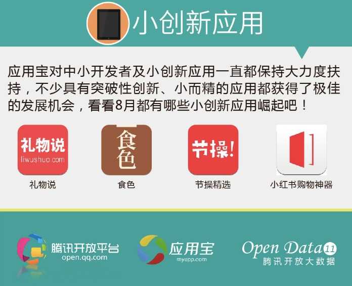 应用宝对中小开发者及小创新应用一直都保持大力度扶持,不少具有突破性创新、小而精的应用都获得了极佳的发展机会。8月里,《礼物说》、《食色》、《节操精选》、《小红书购物神器》等小创新应用纷纷崛起。