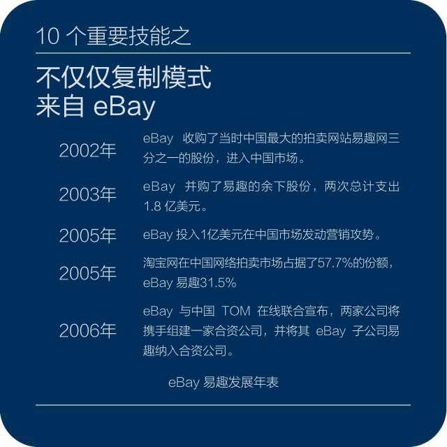 对于阿里最终战胜 Ebay ,阿里巴巴前副总裁 Porter Erisman 这样总结:“ Ebay 在中国犯的最大一个错误就是,他们试图将美国的经营模式照搬到中国市场,可是中国和西方相比有太多的不同,你不能指望仅仅复制一种模式,所以阿里学到的最重要的一点应该就是,他们不能仅仅把淘宝移植到美国,并指望成功。”