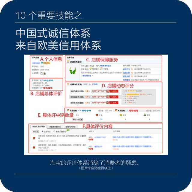 在欧美国家,诚信体系一般由金融系统和社会服务系统共同搭建,每个人、每个企业都拥有完整的诚信记录,调取和使用记录都必须向银行付费。马云关注到了电子商务中买卖双方对诚信度的重视,在中国金融诚信系统尚未完善的时候,自己搭建了一套评价体系,并在推出“中国供应商”后不久就将其打包成产品“诚信通”,将卖家和买家的注册时间、资质、交易记录、双方互评等都纳入其中。这一产品不仅部分解决了网络交易过程中可能的欺诈问题,同时也开始成为阿里巴巴的一块创收来源。