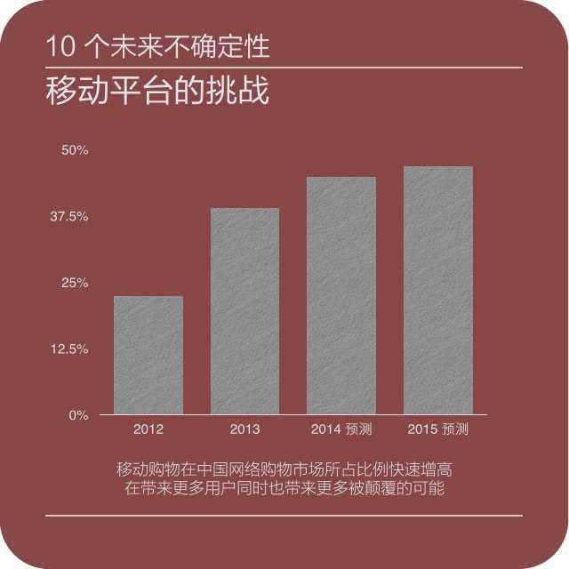 在阿里巴巴提交给美国证监会的招股书中,它承认自己在移动平台上还面临很大挑战。目前阿里的移动平台年总交易额为 4420 亿人民币,占总交易额的 24.1%,而移动平台开始发展才不过几年。可以预见的是,未来移动平台将会成为电商的主要战场,而阿里巴巴需要在这个新的平台上打败对手。