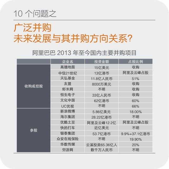 事实上,阿里自2010年起,入股及收购的企业确实是非常多,所涉及的领域也是五花 八门,包括电子商务(上海宝尊、Auctive、一达通、中信21世纪)、物流(普洛斯、星晨急便、新加坡邮政)、本地生活(美团网、丁丁网)、社交网络 (新浪微博、Tango)、浏览器入口(UC浏览器)、LBS服务(快的打车、高德地图、lyft)、影视娱乐(虾米网、华数传媒、优酷土豆)、线下百货 (银泰)甚至文化体育(文化中国、广州恒大)等等。