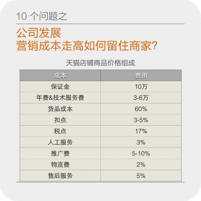 最初电商的价格优势,已经被逐年递增的各类成本取代,天猫和淘宝的各种费用已经到 了令许多商家难以忍受的地步。网络销售的红利逐渐减少,商家赚钱越来越困难,未来阿里的电商平台能否挽留住商家,是一个很大的挑战。