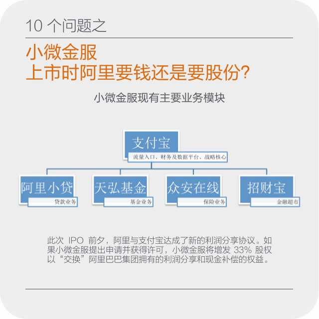 此次IPO前夕,阿里与支付宝达成了新的利润分享协议。阿里巴巴获得的税前利润分享从上一版协议规定的支付宝公司的49.9%调整到小微金服集团的37.5%,尽管比例所有下降,但小微金服不再只是支付宝这一家公司,而是包含了中小企业 贷款、众安在线、天弘基金、招财宝等众多资产,以及未来可能的网络银行业务。