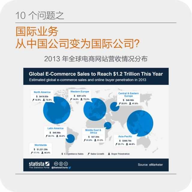 短期来看,阿里巴巴很可能继续将关注点放在中国国内,但是随着国内商业环境内的竞争日益激烈,阿里巴巴的全球化战略将不再是“是否”的问题,而是“何时”。阿里巴巴有着与其全球竞争对手一样丰富的商业经验,也有着国际化的领导层。虽然阿 里巴巴目前仍缺乏一些主要的国外办事处和针对中国以外市场的专属平台,但其创立初期的模式使其业务本身就具有全球化的特性——连接世界各地的买家和卖家。