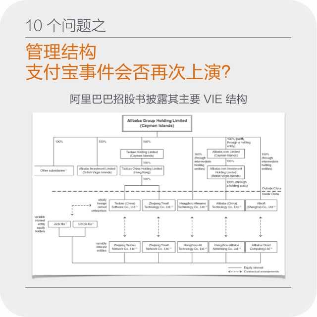 这一事件多年来被不断提及,在此次阿里巴巴路演过程中也成为了最热门问题之一。实际上,支付宝事件暴露出的是阿里巴巴集团错综复杂的VIE结构,以及不受董事会及股东牵制的灵活合伙人制度背后的隐患。