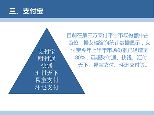 目前在第三方支付平台市场份额中占首位,据艾瑞咨询统计数据显示,支付宝今年上半年市场份额已经增至80%,远超财付通、快钱、汇付天下、易宝支付、环迅支付等。
