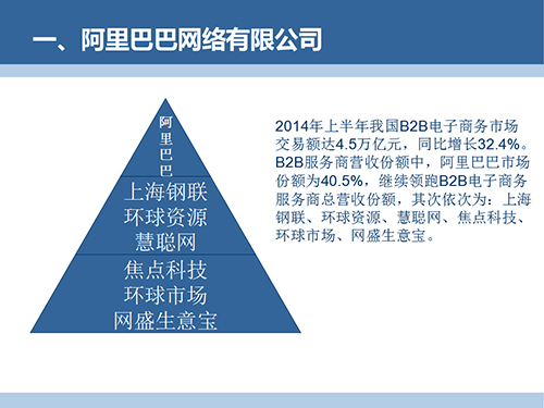 据电子商务研究中心发布《2014年(上)中国电子商务市场数据监测报告》显示,2014年上半年我国B2B电子商务市场交易额达4.5万亿元,同比增长32.4%。B2B服务商营收份额中,阿里巴巴市场份额为40.5%,继续领跑B2B电子商务服务商总营收份额,其次依次为:上海钢联、环球资源、慧聪网、焦点科技、环球市场、网盛生意宝。