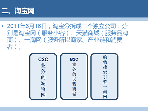 2011年6月16日,马云向阿里巴巴全体员工发邮件称,即日起阿里巴巴集团旗下淘宝分拆成三个独立公司:沿袭原来C2C业务的淘宝网(服务小客)、专注B2C的天猫商城(服务品牌商)、购物搜索引擎一淘网(服务所以商家、产业链和消费者)。独立出来的三家子公司,地位与阿里集团旗下B2B、阿里云等并列。