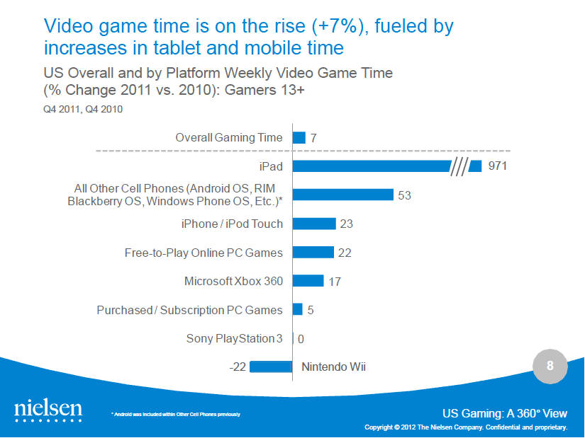 4、用户使用游戏的时间增加了7%,这主要得益于平板和手机的游戏时间的增长