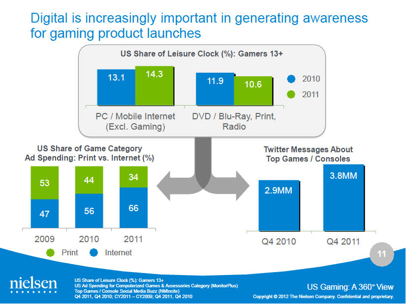 5、数字渠道在影响用户对新游戏认知方面起到的作用越来越大:用户在互联网和移动互联网上花的时间增长了,而传统媒体在减弱;游戏广告的花费也在从纸媒转向互联网;Twitter上对游戏的讨论也在增加