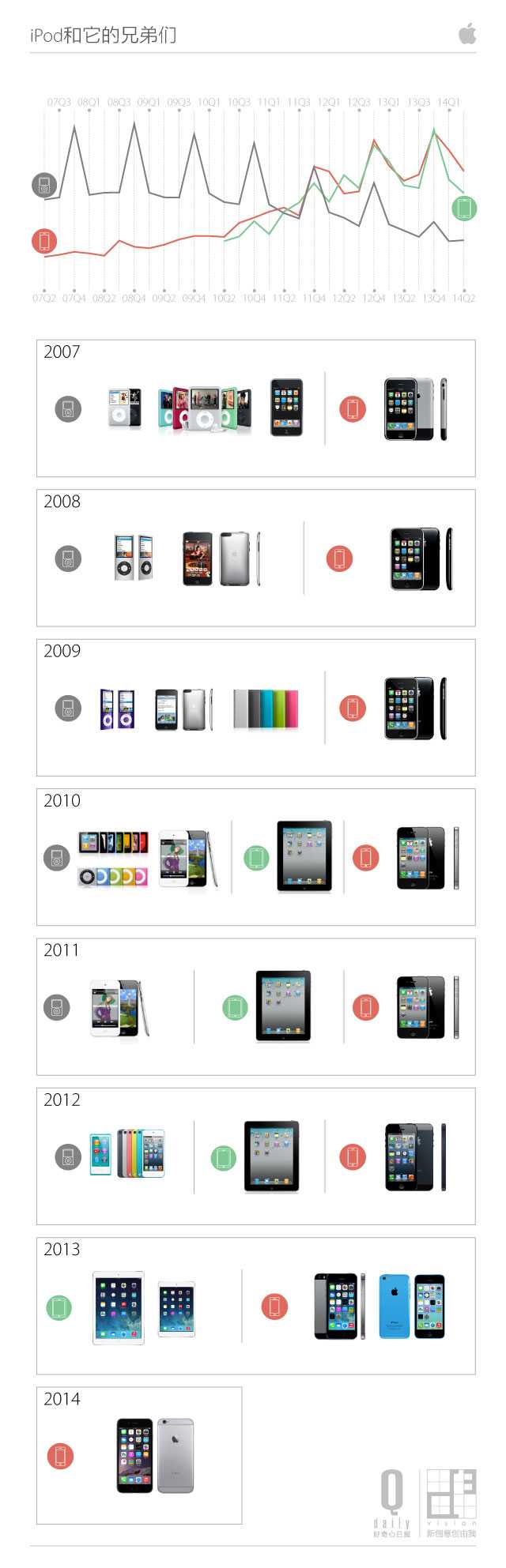 苹果 2014 年第一季度的财报显示,苹果在这一季度里卖出了 5100 万台 iPhone, 2600 万台 iPad,相形之下,iPod 的销售量只有 600 万,相较去年同期,这一数字有近乎 52% 的下降。