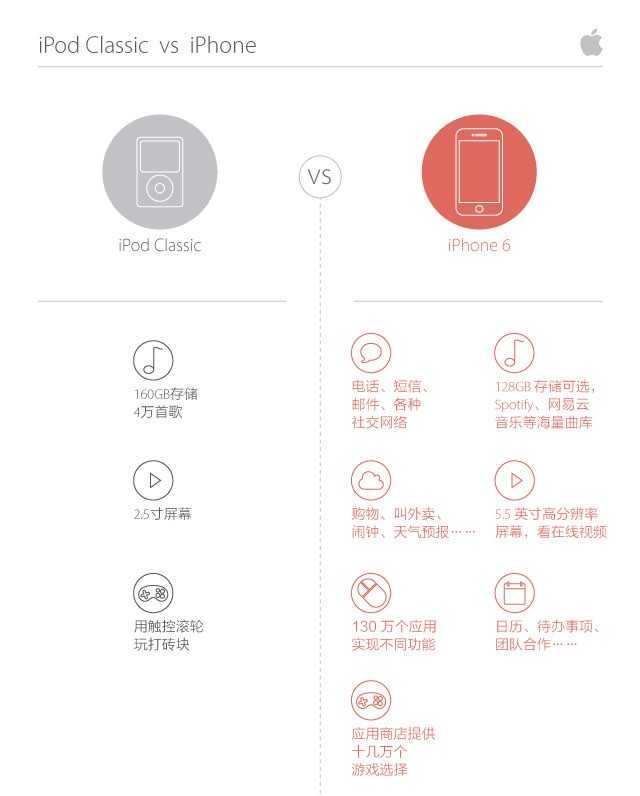 本周的苹果发布两款更大的 iPhone 和智能手表 Watch 获得大量关注。与此同时,苹果从官网悄悄拿掉了 iPod Classic,也是最后一款延续经典设计的 iPod。苹果最后一次更新 iPod 产品线还是 2012 年发布 iPod touch 5——一个没有通话模块的iPhone。