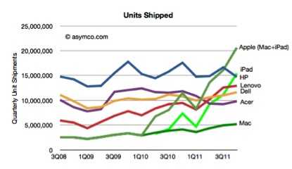 2012年,上市两年的 iPad 销量超过惠普、戴尔、联想和宏碁。配合 Mac 抢占了市场。
