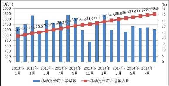 图2.2013-2014年移动宽带用户当月净增数和总数占比情况