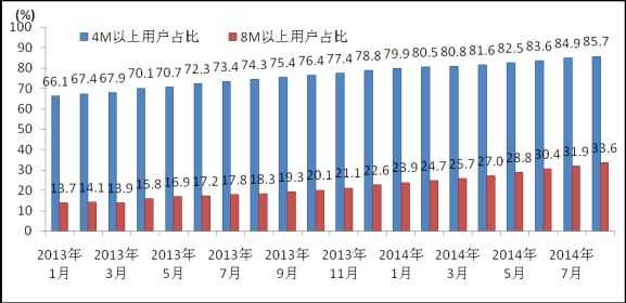 图3 2013-2014年8月互联网宽带接入速率4M和8M以上用户占比情况
