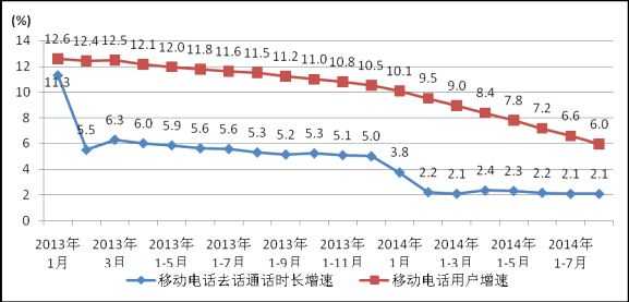 图5. 2013-2014年各月移动话音业务量和移动用户同比增长比较