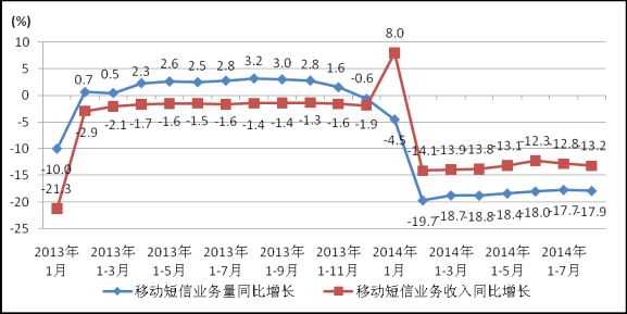 图6. 2013-2014年各月移动短信业务量和移动短信收入同比增长情况
