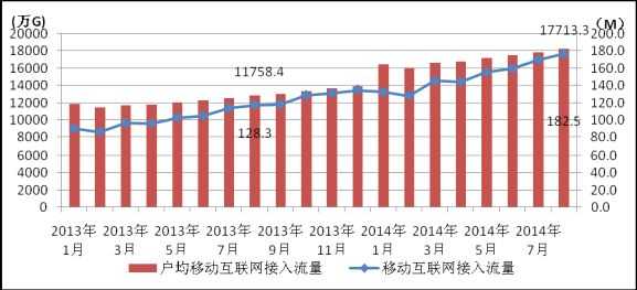 图7. 2013-2014年各月移动互联网接入流量和户均流量比较