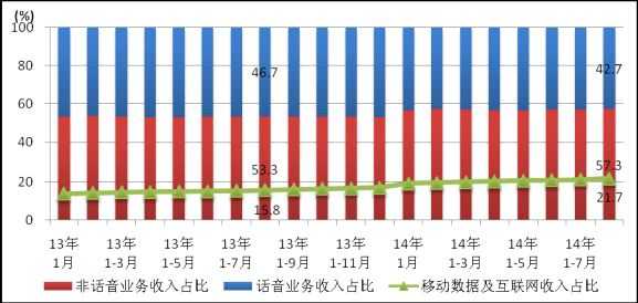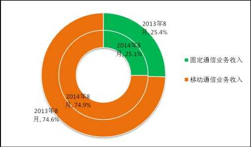 图9 2014年8月电信主营业务收入构成(固定和移动)