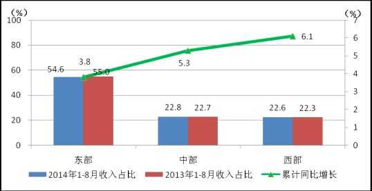 图10 2014年8月东、中、西部电信业务收入同期比较