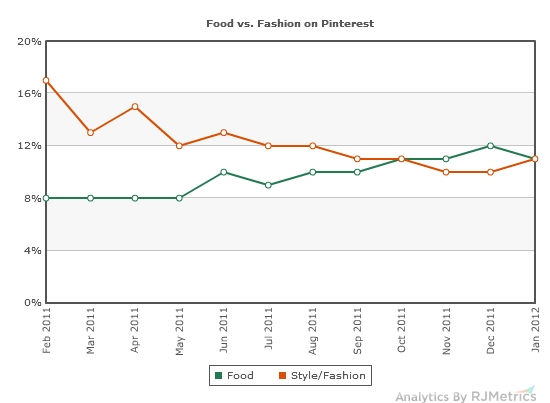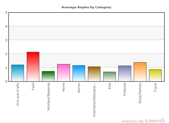 来自RJMetrics的一份报告显示,尽管“食品”还未成为Pinterest上最受欢迎的标签,但是其增长速度是最快,并且是该网站上被分享最多的一个标签。而对于电商来说,一个专门为其提供折价销售的专区“我喜欢的产品”这个Pinboard已成为第三个最受用户欢迎的板块。同时,在Pinboard上Pin的产品也非常的受到其它用户的欢迎。而对于我们,从这些用户行为中读出什么才是最重要的。下面我们具体看一些数据: