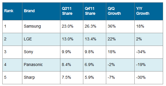 2011年第四季度,三星全球平板电视营收占比提高到26.3%,为所有品牌历史最高,且较第三季度提高了三个百分比。此外,在液晶电视和等离子电视方面,三星营收占比仍然遥遥领先,且等离子电视占比首次超过松下而居于首位;三星也是3D电视和LED电视市场的领先品牌。乐金电子为全球第二大品牌,占比为13.4%,且是除了三星以外唯一一个前五大品牌中在第四季度取得营收成长的品牌。索尼排名第三,营收占比为10%,但较去年同期下降了30%以上。