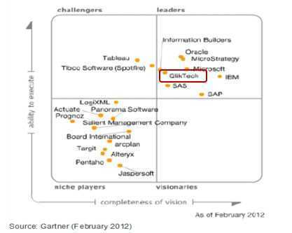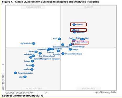 大数据分析系统在业内也称为商业智能(BI)。2006年,在Gartner公布的BI魔力矩阵中,标榜为领导者区域的第一象限还看不到一家敏捷BI厂商,全部是大家熟知的传统BI厂商,例如IBM Cognos、SAP Business Objects等。直到2012年,Gartner公布的BI魔力矩阵第一象限中才见到第一家敏捷BI厂商QlikTech。但是,到了2014年,Gartner的BI魔力矩阵的第一象限中就已经出现三家敏捷BI厂商了,在数量上占据了近半数的规模。