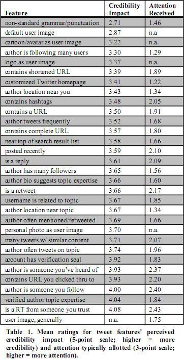 微软:让一条微博显得可信的原因 根据微软和卡耐基梅隆大学的研究,让一条微博显得可信的原因有:你信任的人发的;作者是该领域的专家;你关注了作者;微博中包含了链接;你听说过该作者;被认证作者;作者经常聊相关内容;作者的头像是真人;作者经常被提及或转发;这几项的得分见下图 更多阅读:Twitter:2Q19日活用户加速增至1.39亿人CMU:Twitter用户说只有36%的内容值得一读eMarketer:日本网民尤爱Twitter数据解读微博导师Twitter为何被微博学生给超了Twitter:2019年1季度日活跃用户数同比增长11%至1.34亿人benjaminmayo:Twitter自有客户端的市场份额达77%美国四大社交上市公司数据回顾和战略展望财报数据显示Twitter突然又行了Twitter:1Q20日活用户增长24%至1.66亿人Twitter:4季度用户增至1.5亿 利润下滑却仍然受市场追捧Twitter:2Q20吃瓜群众显著增加 推特用户高速增长34%Twitter:3季度广告主报复性消费拉动营收增长财报透露Twitter用户参与度首度下滑Twitter:4Q17首度实现盈利,日活用户连续5个季度保持两位数增长eMarketer:中国网民喜欢玩微博
