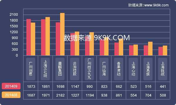 点评:本月未新增上榜研发商,少数研发的排名发生了变化:本月广州创思排在了榜单第一位,纵观游戏排行榜可以看出其有三款产品上榜《魅影传说》、《赤月传说》、《烈焰》,其中《魅影传说》更是新生产品中的佼佼者。上海心动游戏和上海易娱本月排名小有变化,从产品开服数量来看上海易娱下降趋势明显且本月无一作品上榜,近期曝光一款新游《全民倒塔》入驻37游戏,除此款产品外已有诸多产品借37游戏这块风水宝地展露风采了。上海心动本月有一款产品入驻趋势较好—《深渊》本月新入驻了游戏风云、金山猎豹、开心网、酷狗游戏、酷我游戏、PPS游戏、37游戏、7K7K、起点游戏,据9K9K最新网页游戏开服数据统计入驻的一线平台共21家。