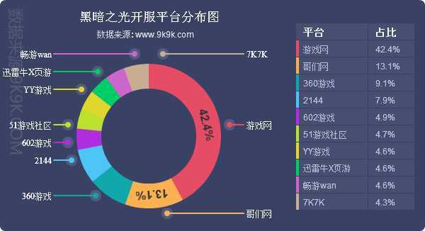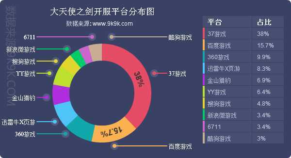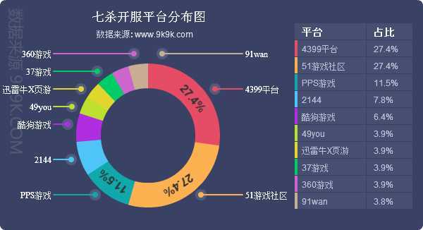 点评:《七杀》本月排名上升了一位,从数据来看并未呈涨势,在各平台的分布比例变化不明显;新增分布比例的平台:迅雷牛X页游,分布比例3.9%。