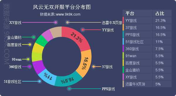 点评:《风云无双》本月排名下降了一位,从占比来看本月在YY游戏的占比增加了5个百分点,其本月在YY游戏的开服频率有所增加;新增分布比例的平台:百度游戏,分布比例5.5%。